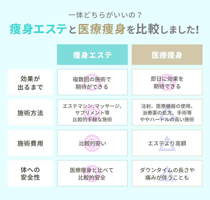 また、施術にかかる費用については、医療痩身よりも比較的安価であることが特長です。実際に痩身エステを体験した多くの人が効果を実感しており、施術だけでなく、食事や運動といった生活習慣の見直しやサプリメントに関するアドバイスを受けられる点も大きなメリットと言えます。